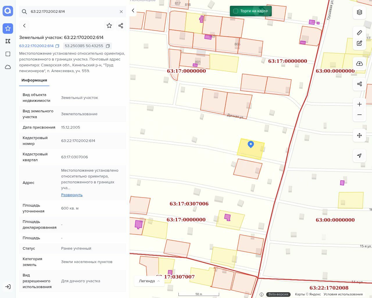 Лот №2. Вид объекта недвижимости: земельный участок, кадастровый номер: 63:22:1702002:614, категория земель: земли населенных пунктов, виды разрешенного использования объекта недвижимости: Для дачного участка, площадь: 600 +/- 8.57 кв.м., вид права, доля в праве: собственность, дата государственной регистрации: 05.10.2018, номер государственной регистрации: 63:22:1702002:614-63/003/2018-2, основание государственной регистрации: Договор купли-продажи земельного участка, выдан 27.09.2018 Договор купли-продажи земельного участка (предварительный), выдан 28.08.2018.