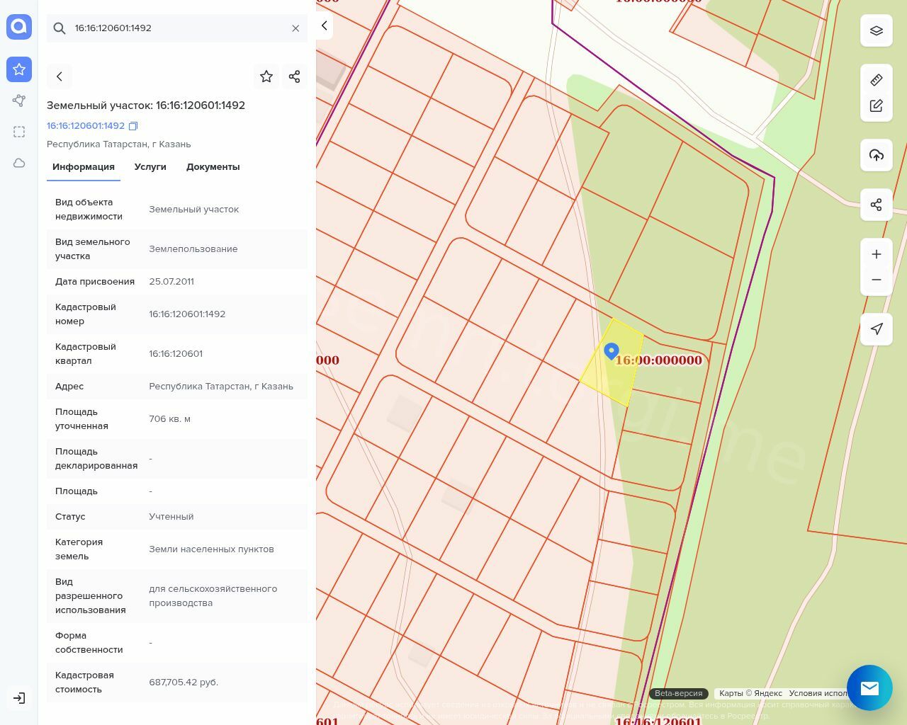 Земельный участок площадью 706 +/- 9 кв.м, кадастровый № 16:16:120601:1492, категория земель – земли населенных пунктов, вид разрешенного использования: для сельскохозяйственного производства.