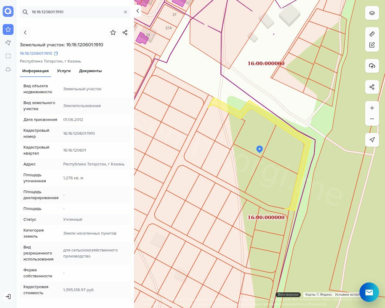 Земельный участок площадью 1276 +/- 13 кв.м, кадастровый № 16:16:120601:1910, категория земель – земли населенных пунктов, вид разрешенного использования: для сельскохозяйственного производства.